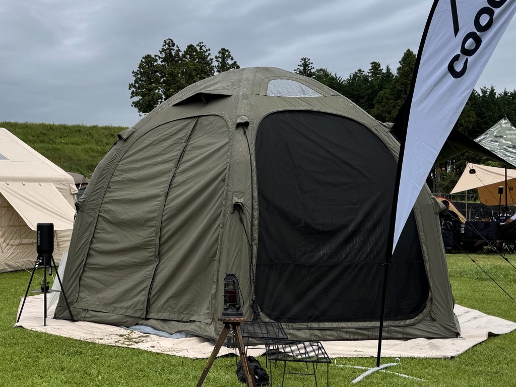 展示では、『Hama 802Camp』さんがふだん使用している内装を再現していただきました。オプション品のTPUウインドウも設置し雨除け・風除けを兼ねたロマン溢れるスタイルを実演。グランピングエアテントとしてのcoodyらしさを最大限に表現し、多くの来場者の注目を集めました。