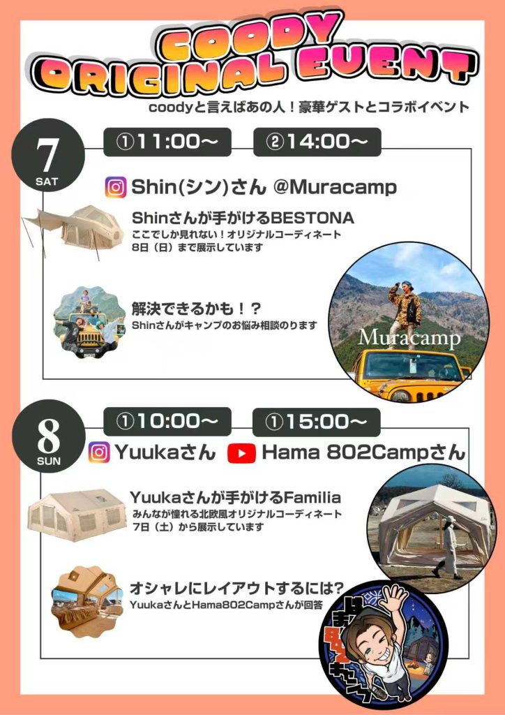 coodyのテントをベースにそれぞれの個性を出す市販アイテムを提案、現地ではミニトークイベントも開催します!