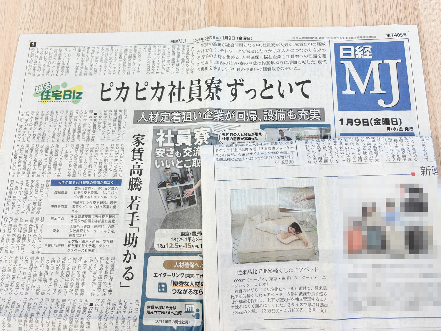 【新聞掲載】日経MJ (2026/1/9発行)にcoodyAIRBLOCKコレオ(COREO)が掲載されました。 2026 2/09 日経MJ (マーケティング・ジャーナル)日本経済新聞社にcoodyエアベッドコレオ(COREO)が掲載されました。 ▼公式サイトはこちらhttps://xtrend.nikkei.com/sp/mj/ 投稿 掲載情報 FOLLOW ME URLをコピーしました! URLをコピーしました! 関連情報 【雑誌掲載】日経トレンディ 3月号(2026/2/4発売)にcoodyBESTONAを掲載しました。 【雑誌掲載】GOOUT 2月号(2025/12/27発売)にcoodyBESTONAを掲載しました。 【掲載情報】CAMPHACKに「進化が止まらない最新“エア式テント”8選」としてcoodyBESTONAが掲載されました。 【掲載情報】CAMPHACKにcoody AIR BLOCK COREO(エアブロック コレオ)が掲載 【メディア掲載】MonoMax Webにて次世代エアテント「Bestona」が紹介されました 【掲載情報】CAMPHACKに「“coody エアテントやっぱり憧れる“coody”がついに日本上陸!」の記事が掲載されました。 【TV出演】ひるおび(TBS)にて「TOKYO OUTDOOR SHOW 2025」出展のcoodyブースを紹介いただきました。