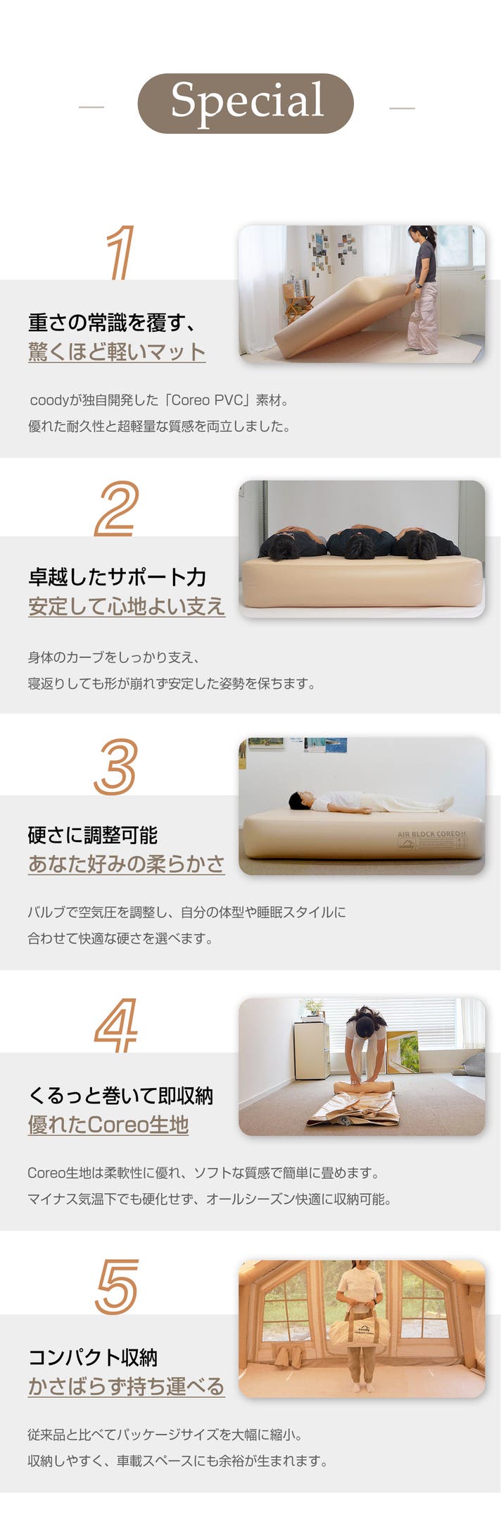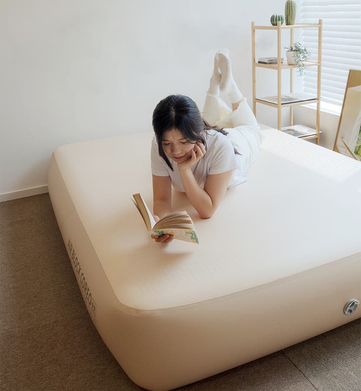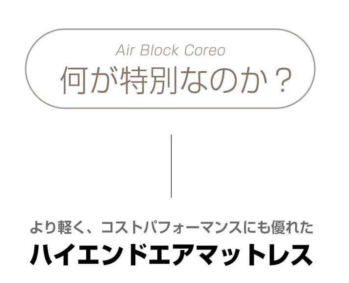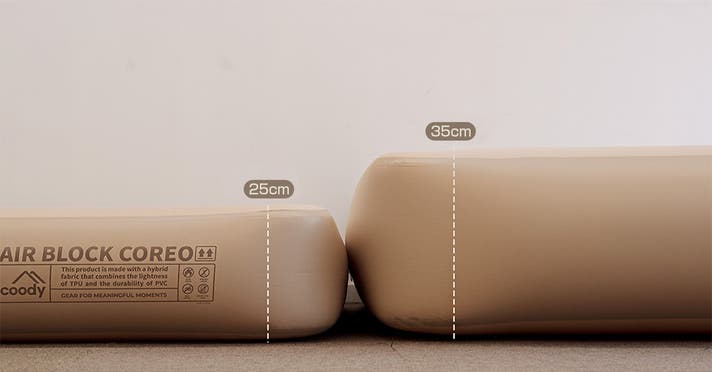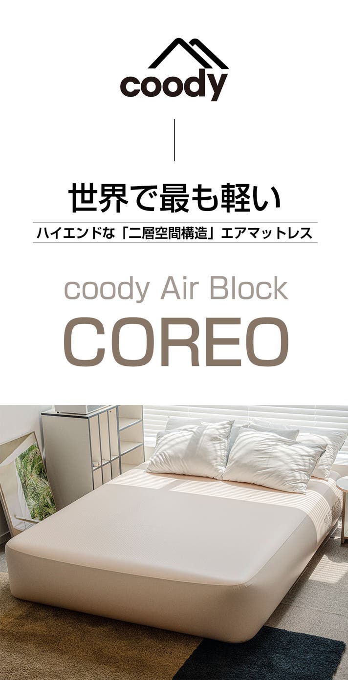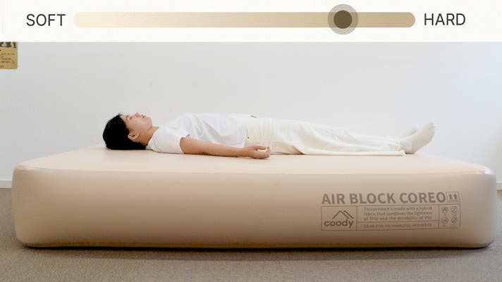 coodyのラグジュアリーキャンピングエアマット「Air Block COREO」は、重さわずか6.13kg。軽くて扱いやすく、上質な寝心地を実現しました。