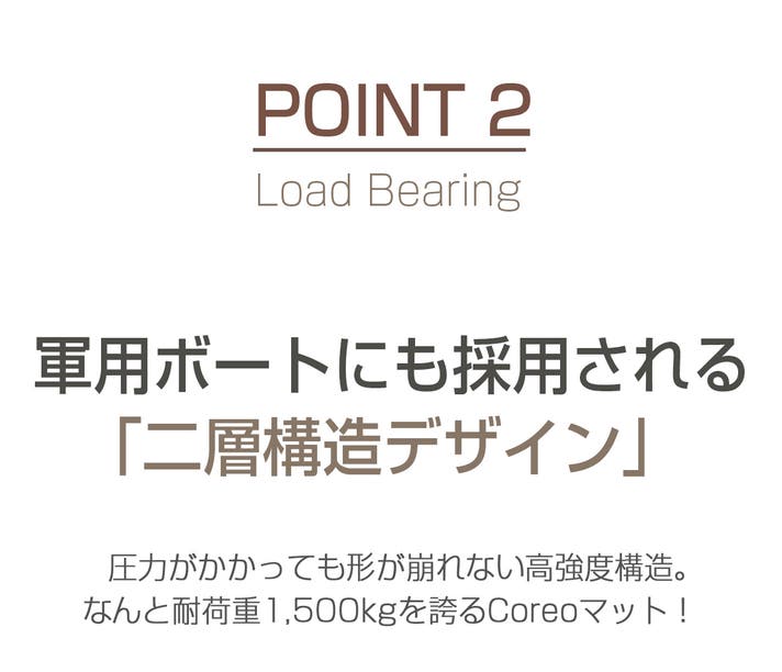 coodyが独自に開発した「COREO PVC」により、スチールワイヤーのような弾力と強度を兼ね備えた特殊繊維を一本一本形成。数万本にも及ぶCOREO PVC繊維が内部の“骨格”となり、マット全体をしっかりと支えます。