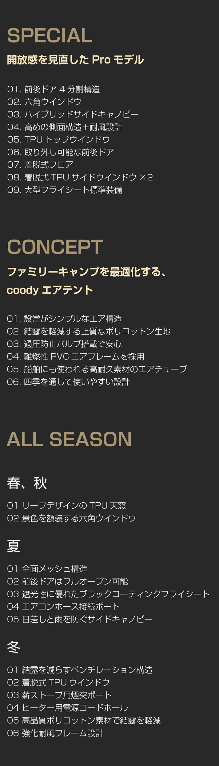 設営のしやすさから、滞在中の快適さまで。ひとつひとつのディテールに、使いやすさを込めたテント——それがcoody「pro」シリーズです。
