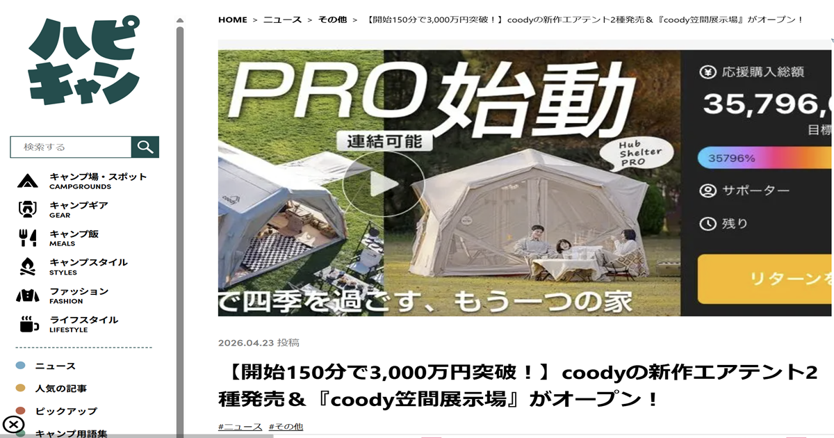 アウトドア情報メディア「ハピキャン」にて、coodyのMakuakeプロジェクトが紹介されました。