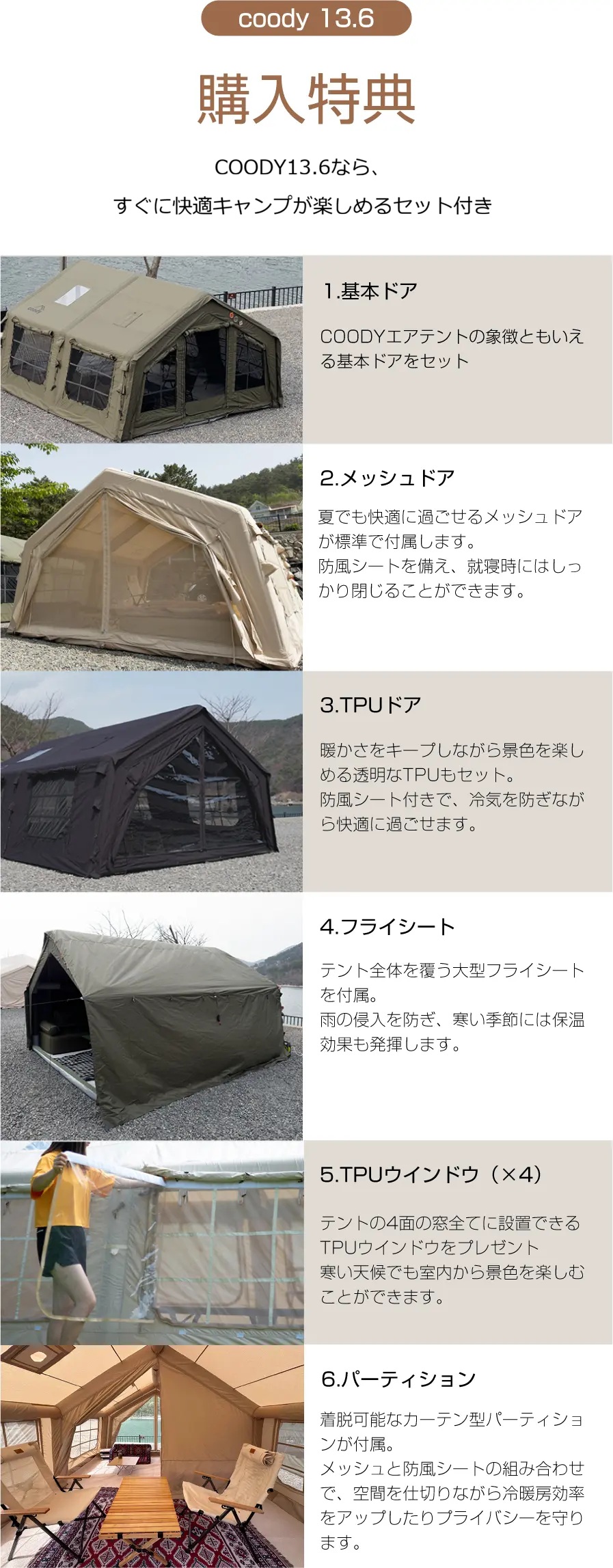 商品内容エアテント(テント専用バッグ入)、フライシート、基本ドア、TPUドア、メッシュドア、TPUウィンドウ、スチールペグ、張り網、手動ポンプ、修理キット