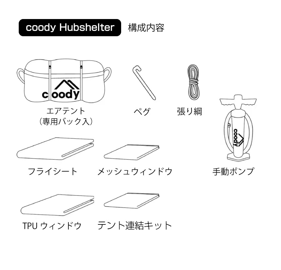 ハブシェルターを他のcoodyエアテントにドッキングすれば、スペースを拡張してより快適に活用可能!