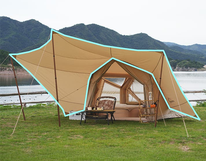タープを広げることで、左右にわたりテント全体を包み込むようにカバー。