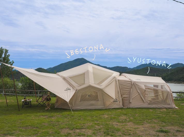 coody エアテントYUSTONAは、BESTONAのタープ(別売)と連結可能。
