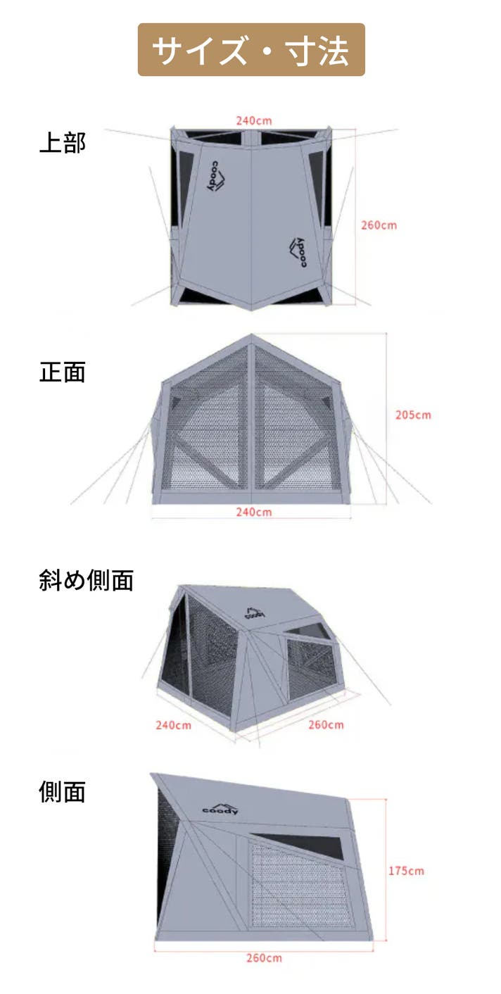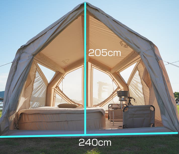 coody エアテントYUSTONAは、全長260cm × 幅240cm × 高さ205cmのゆとりある設計。
