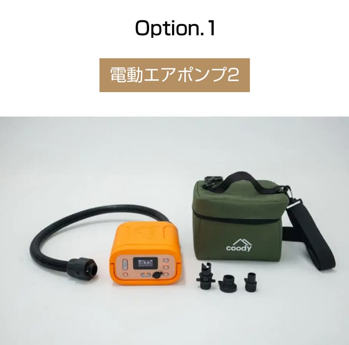 電動ポンプ(別売)を使用すれば、スイッチひとつで自動充気が可能です。設定した圧力に達すると自動で停止し、約5-8分で設営が完了します。