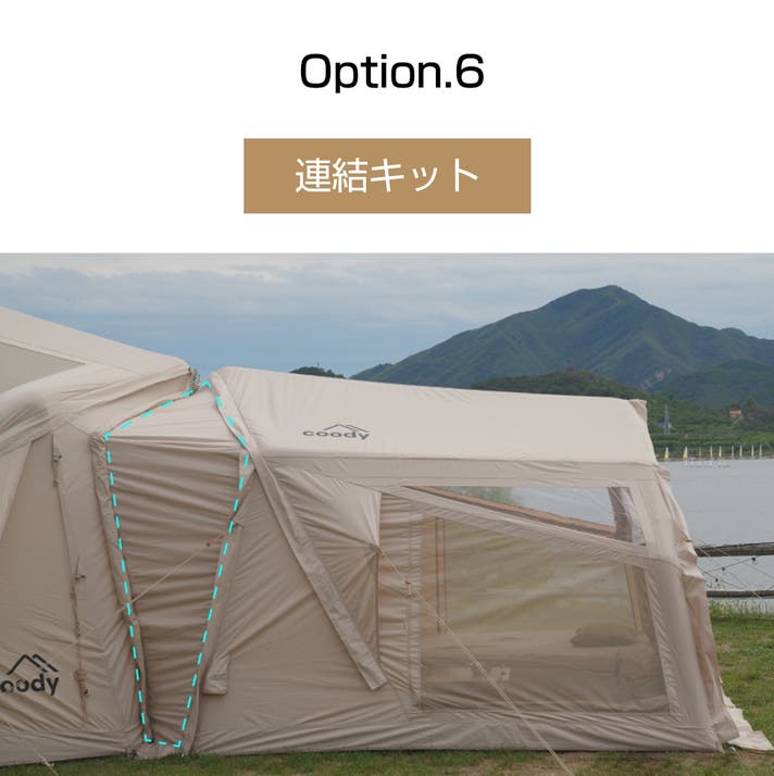 coody エアテントYUSTONAは、連結布(別売)を使って、ジッパー付きのcoodyテントと接続可能。自分だけの“理想のキャンプ空間”をつくれます。